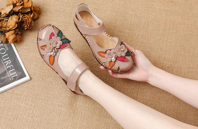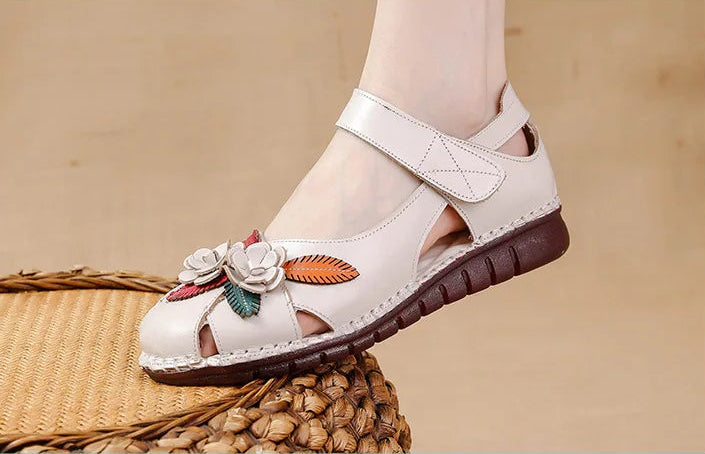 Sandales Plates en Cuir Véritable Motif Floral Lorilury - Confort Orthopédique et Style Rétro