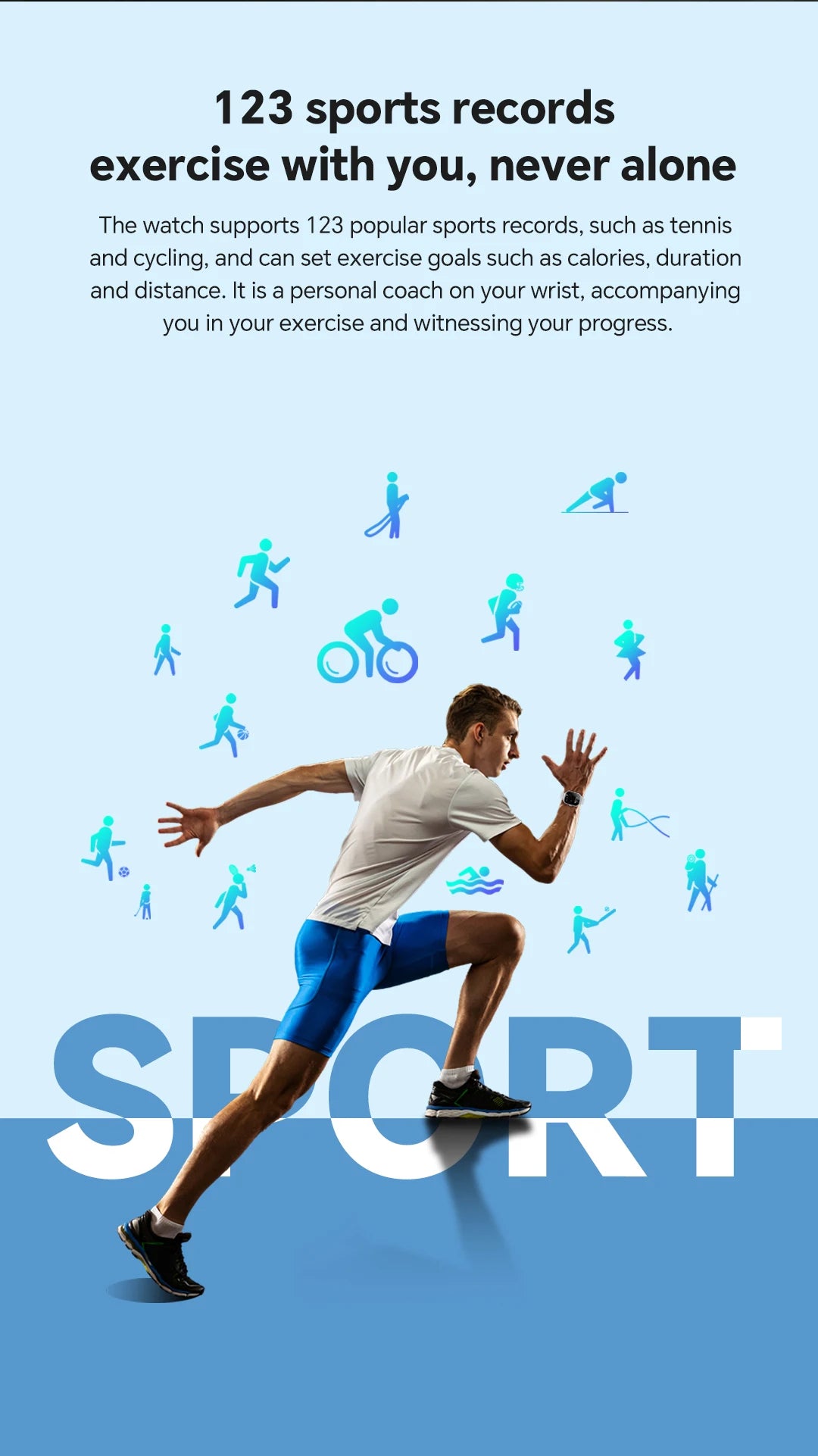 Que vous pratiquiez la course, le cyclisme, la natation, l'escalade, le ski, le tennis ou toute autre activité, cette montre sport enregistre vos itinéraires, suit vos métriques en temps réel (calories, distance, pas) et vous aide à atteindre vos objectifs d'entraînement.