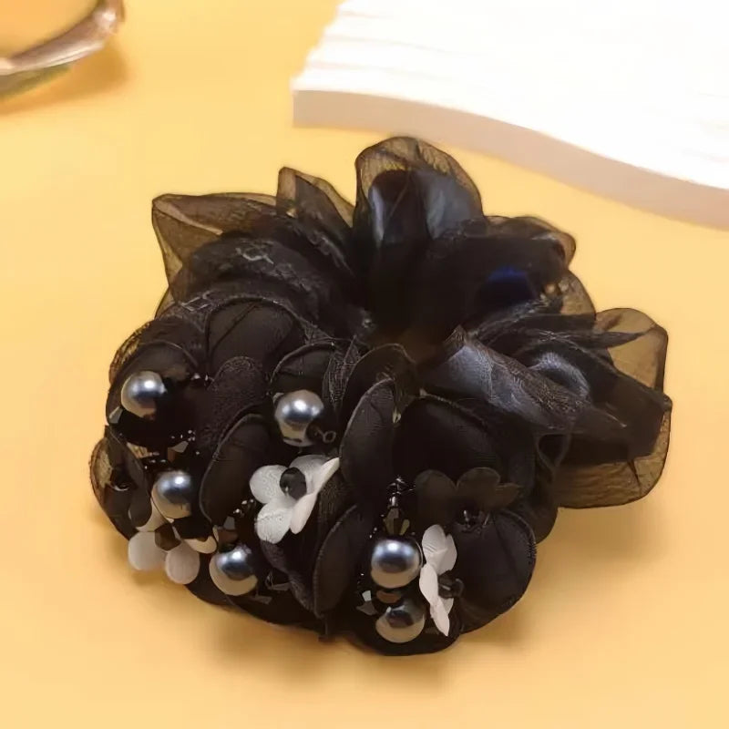 Sublimez votre coiffure avec ce chouchou élégant orné de 3 fleurs et d'une perle. Cet accessoire cheveux combine raffinement et fonctionnalité pour créer des coiffures sophistiquées en un instant.