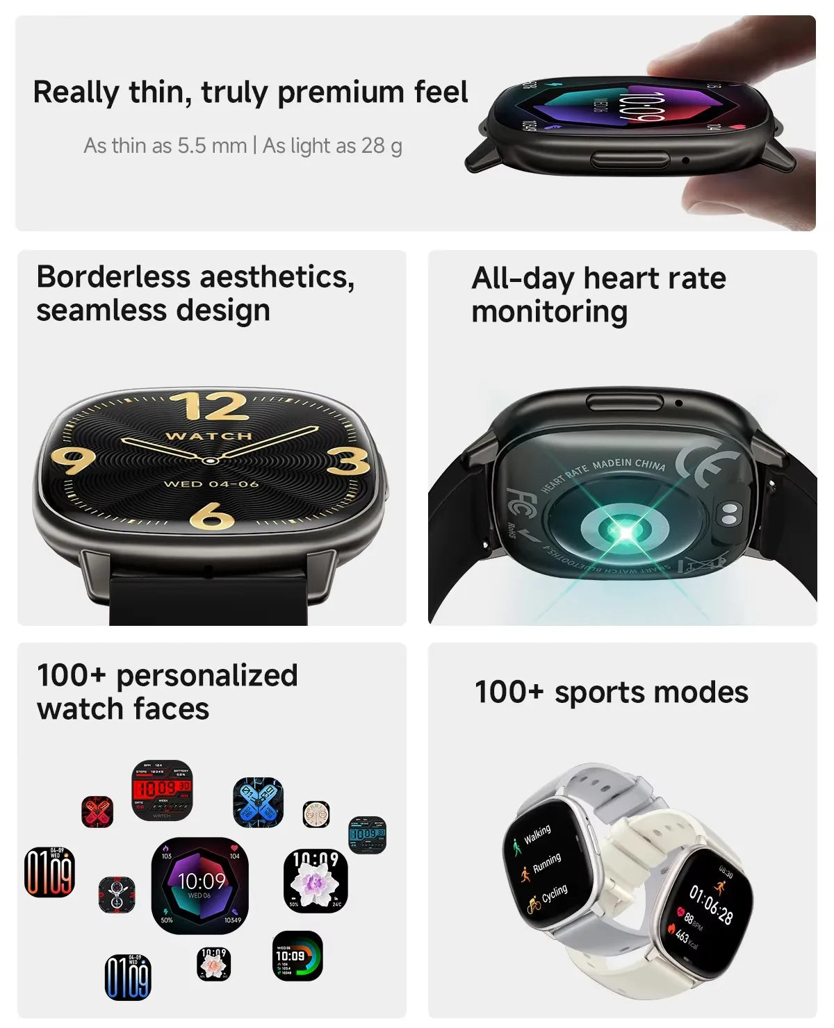 - Écran AMOLED carré 1.73" (402x402) - Qualité d'affichage exceptionnelle