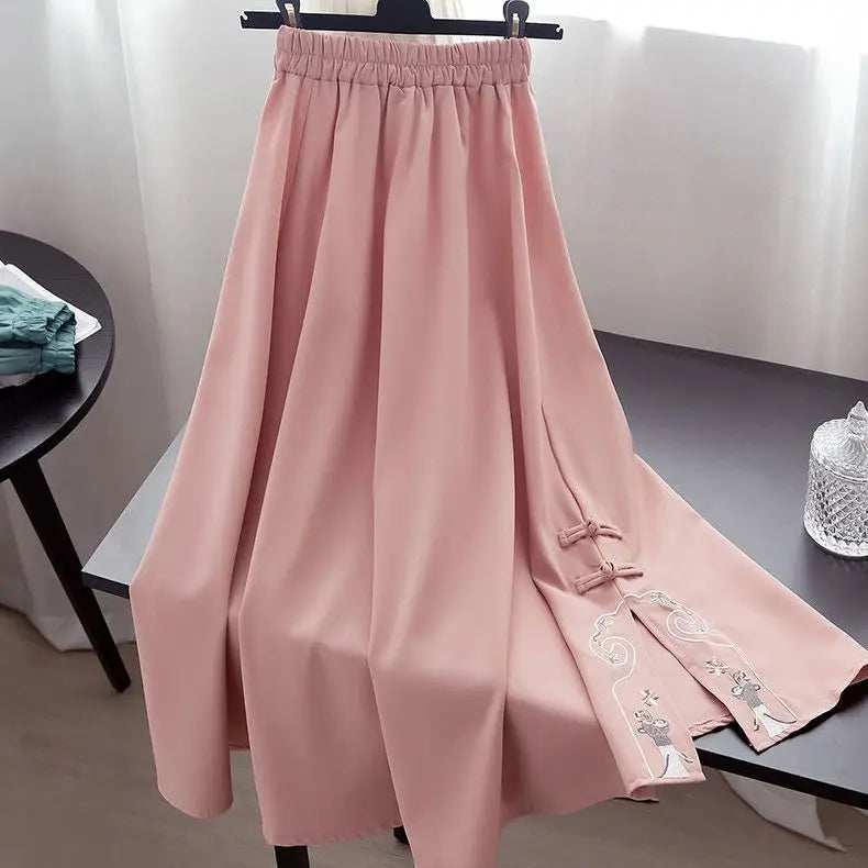 La coupe élégante de cet ensemble est inspirée des silhouettes traditionnelles Hanfu, avec des lignes fluides et gracieuses qui créent un mouvement poétique. Le haut met en valeur le buste avec délicatesse, tandis que la jupe crée une silhouette féminine et romantique.
