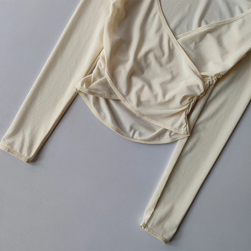 Découvrez notre t-shirt sport femme col V manches longues avec panneaux mesh, conçu pour vous offrir une respirabilité exceptionnelle pendant vos séances de yoga, fitness, running ou musculation. Son design croisé moderne et son tissu technique garantissent style et performance.