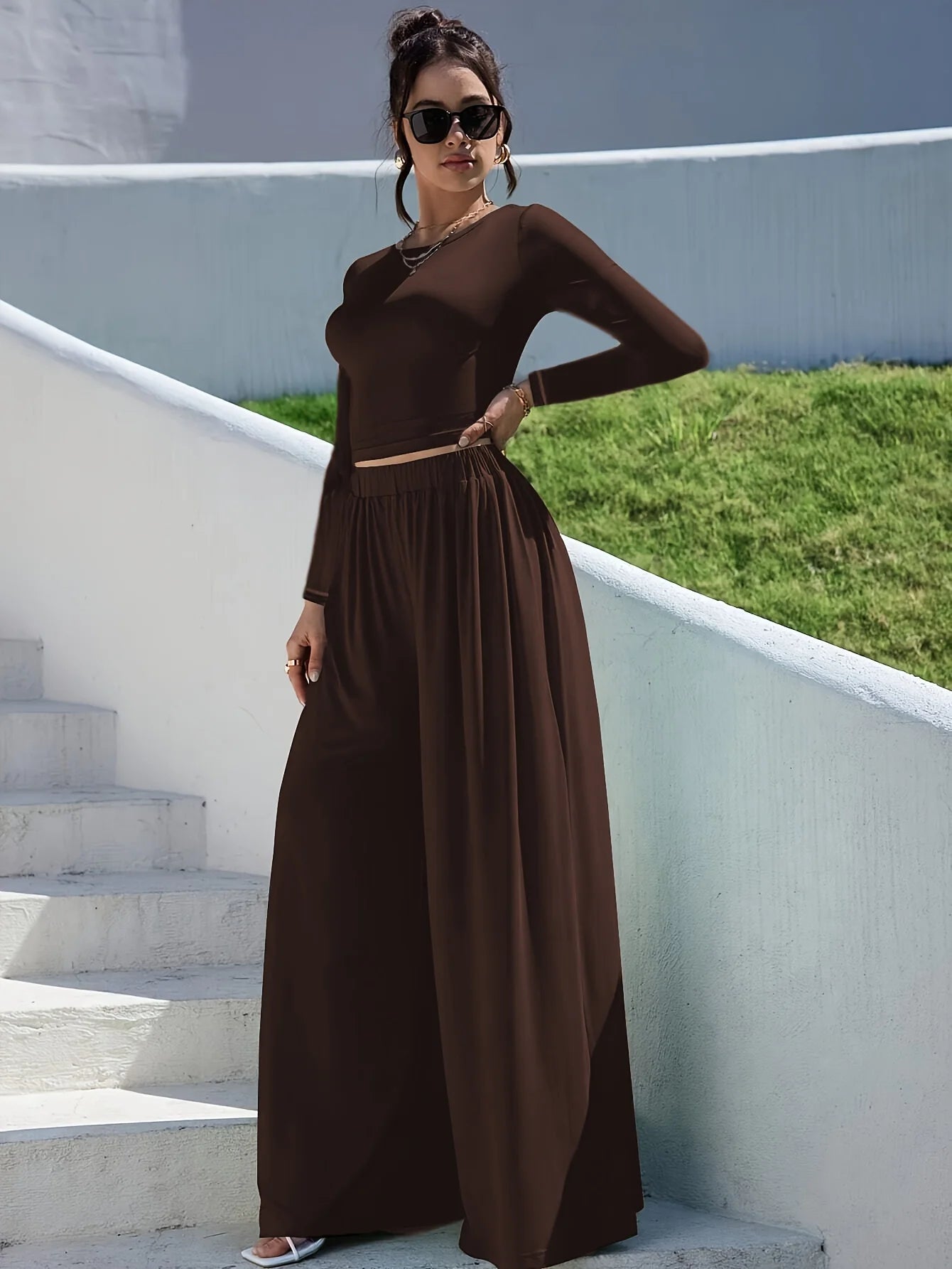 Cet ensemble coordonné en maille vous offre une solution mode complète sans effort de coordination. Le t-shirt tricoté apporte une touche d'élégance décontractée, tandis que le pantalon large garantit confort et style tout au long de la journée. La couleur marron chaleureuse s'intègre facilement dans votre garde-robe et se marie avec tous vos accessoires. Idéal pour les femmes qui recherchent un look casual-chic sans compromis sur le confort.