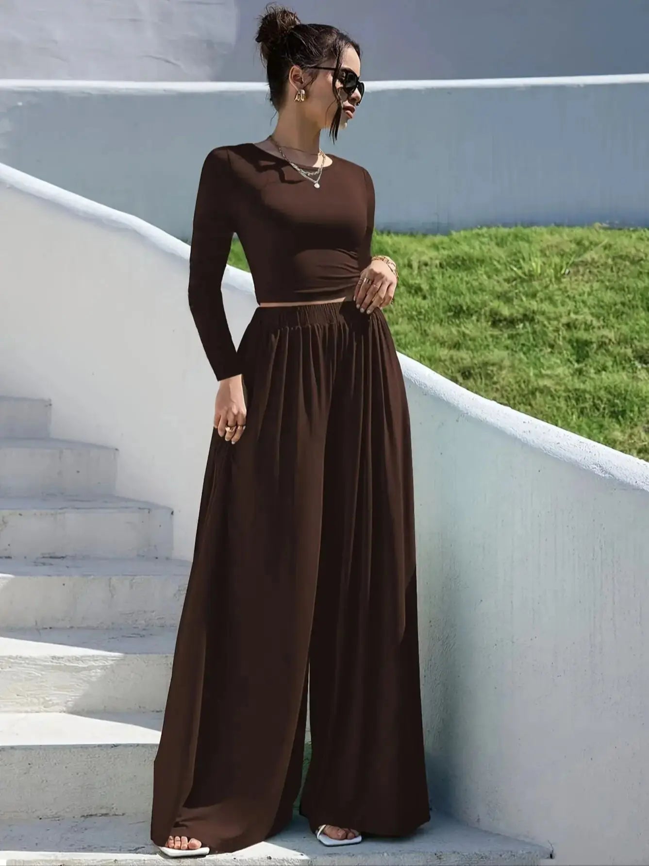 Ensemble Maille Femme Marron - T-shirt Tricoté & Pantalon Large Multi-Saisons