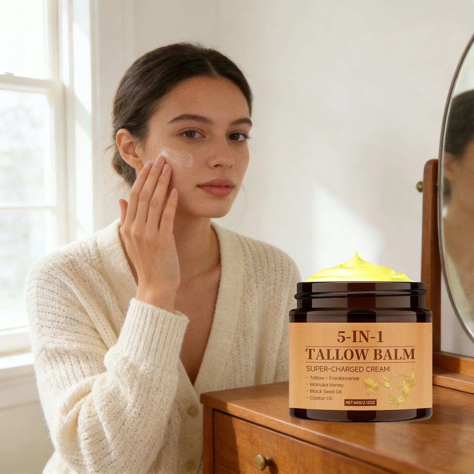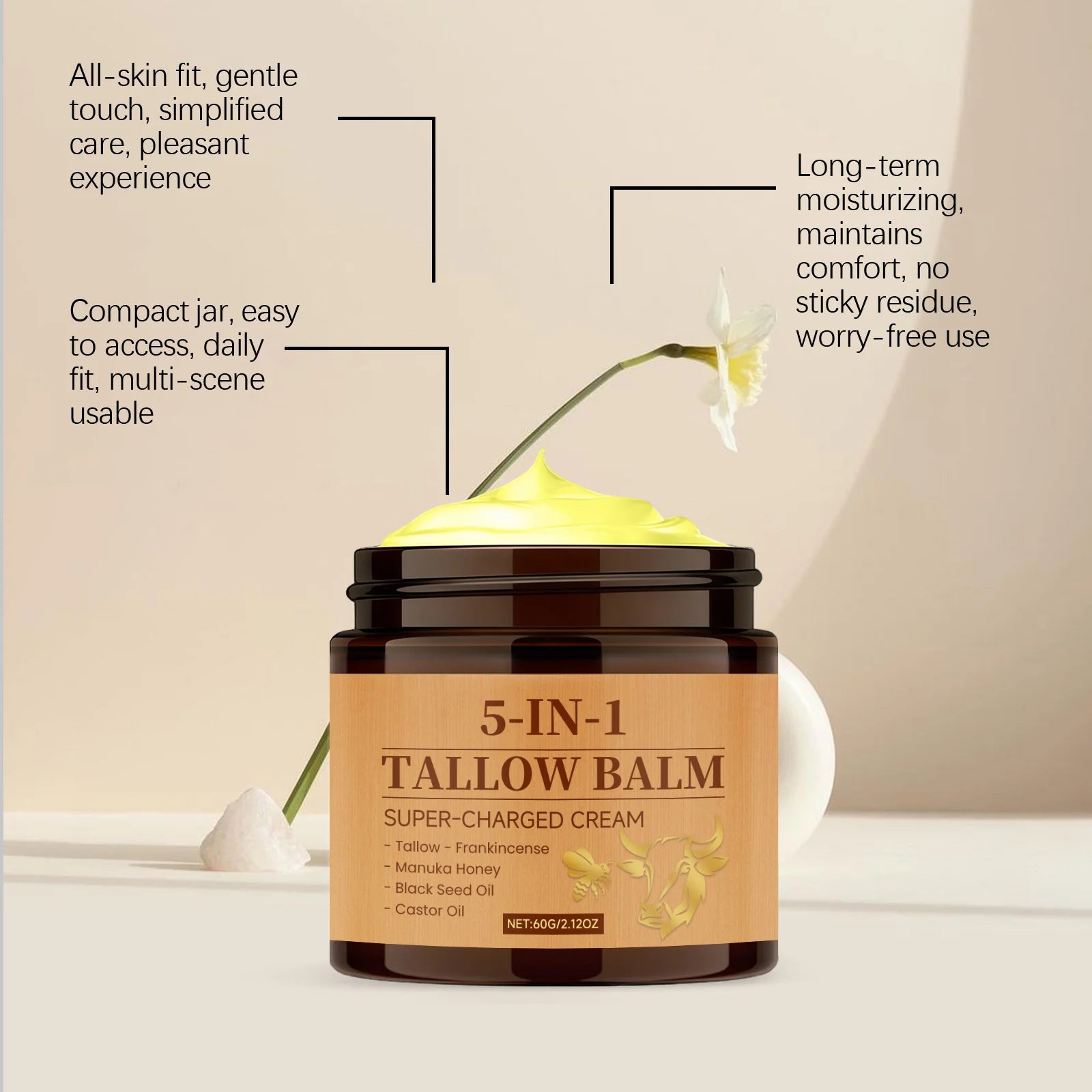 Découvrez le soin ultime tout-en-un avec notre baume 5 en 1 au suif de bœuf et miel, une formule révolutionnaire qui nourrit les peaux sèches, éclaircit le teint, répare, atténue les rides et adoucit la peau. Ce baume fouetté multi-usage convient au visage, mains et corps pour une hydratation profonde et une réparation complète.