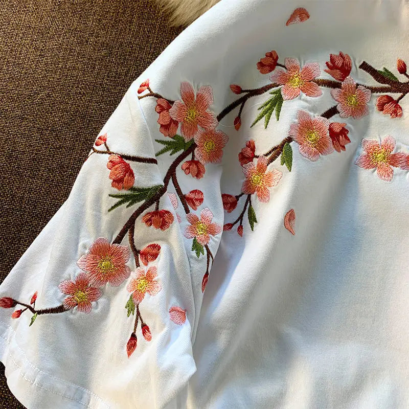 T-shirt Femme Broderie Cerisiers - Élégance Japonaise Raffinée