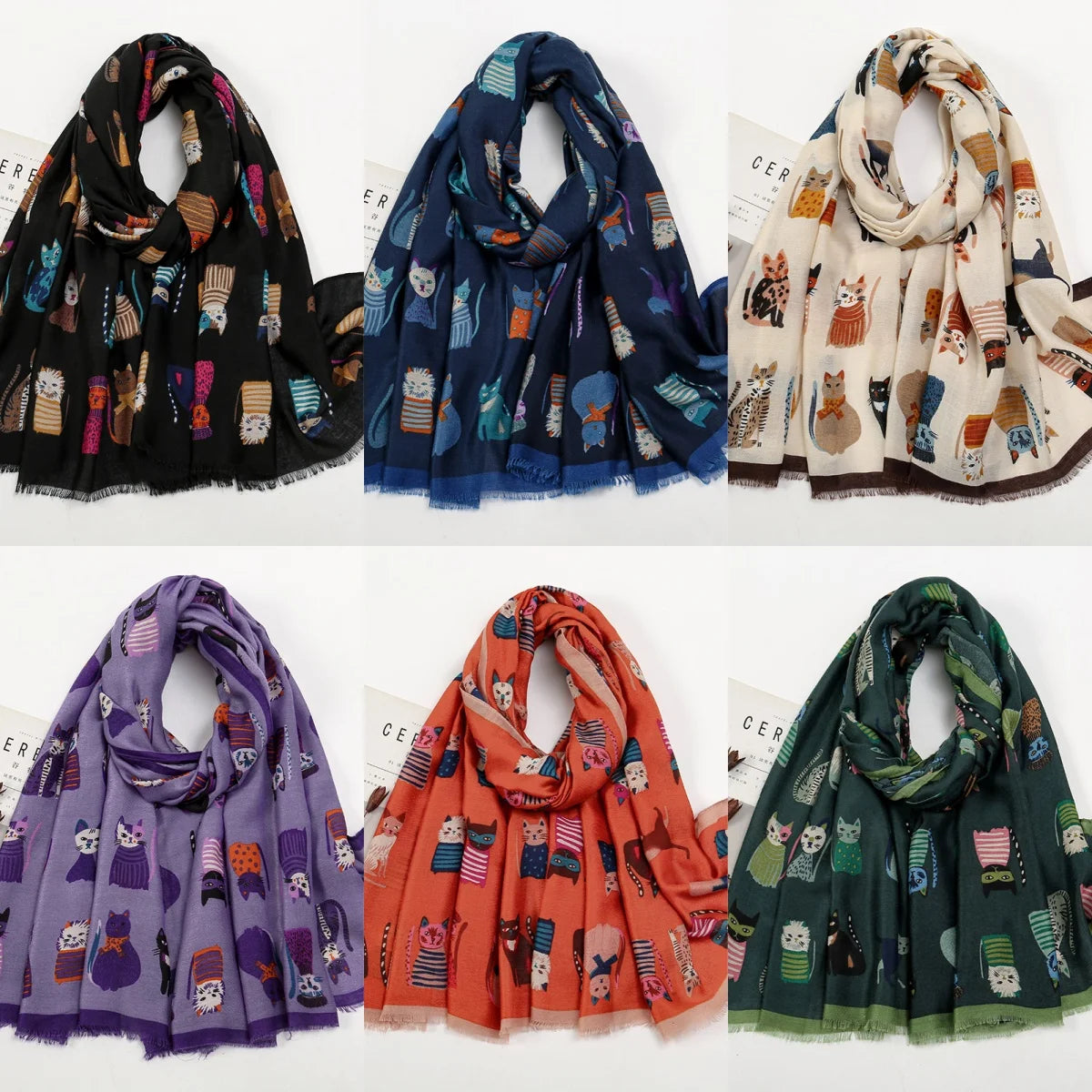 Cette écharpe en viscose combine douceur et originalité avec son motif chat cartoon coloré. Parfaite pour ajouter une touche fun et mignonne à vos tenues au quotidien.