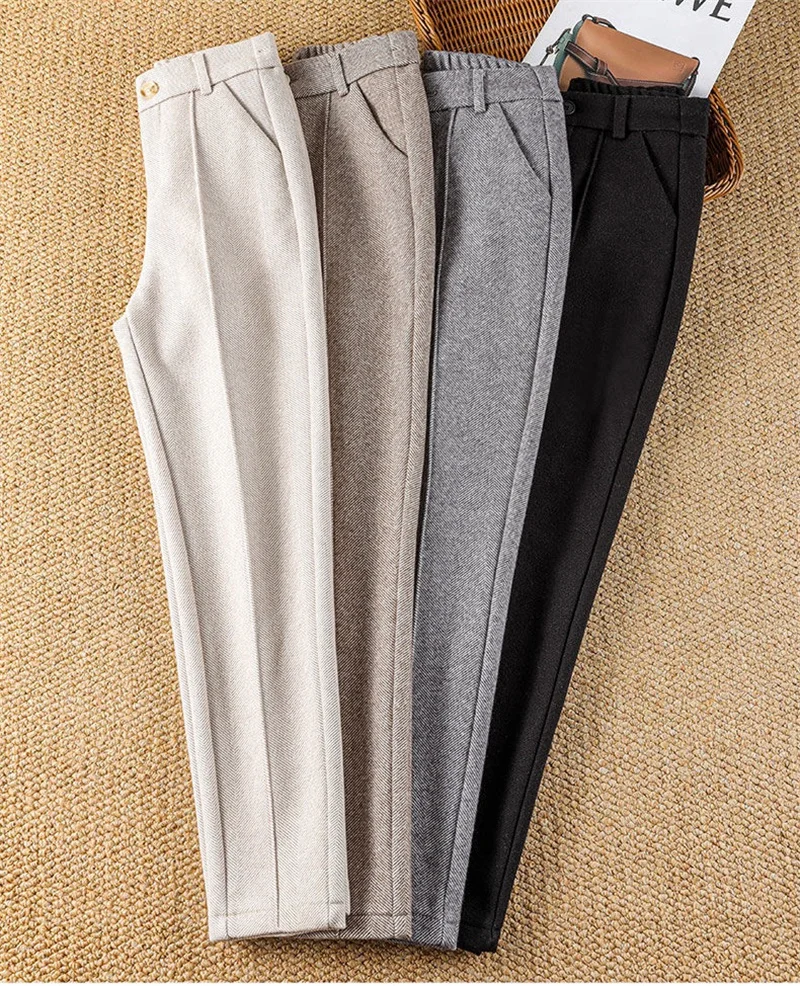 Pantalon femme en laine taille haute avec doublure velours épaisse. Parfait pour l'automne et l'hiver, ce pantalon sarouel décontracté offre chaleur et confort optimal.
