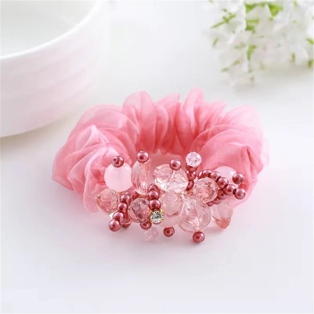 Chouchou Perle Brillante Fleur Organza Transparent - Élastique Cheveux Fille Élégant | MDN
