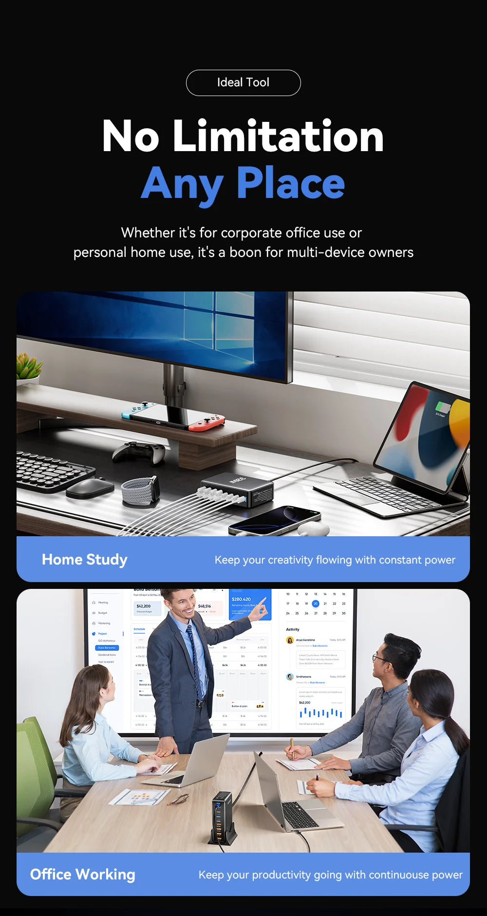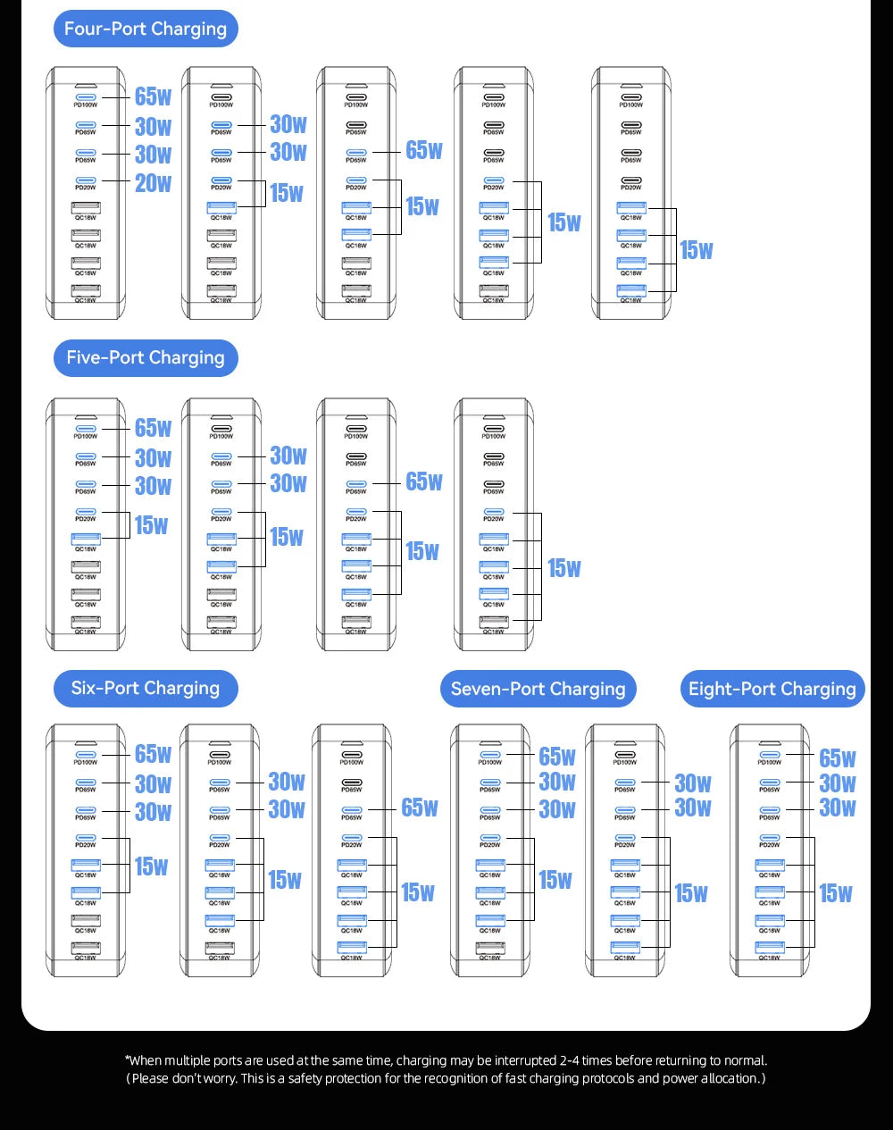 Révolutionnez votre expérience de charge avec notre station de charge GaN 320W ultra-puissante ! Grâce à la technologie GaN (Nitrure de Gallium) de nouvelle génération, chargez jusqu'à 8 appareils simultanément avec une efficacité maximale et un encombrement minimal.