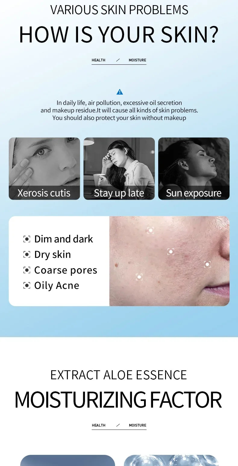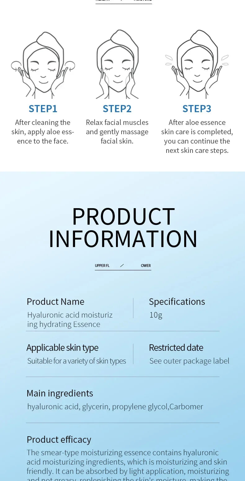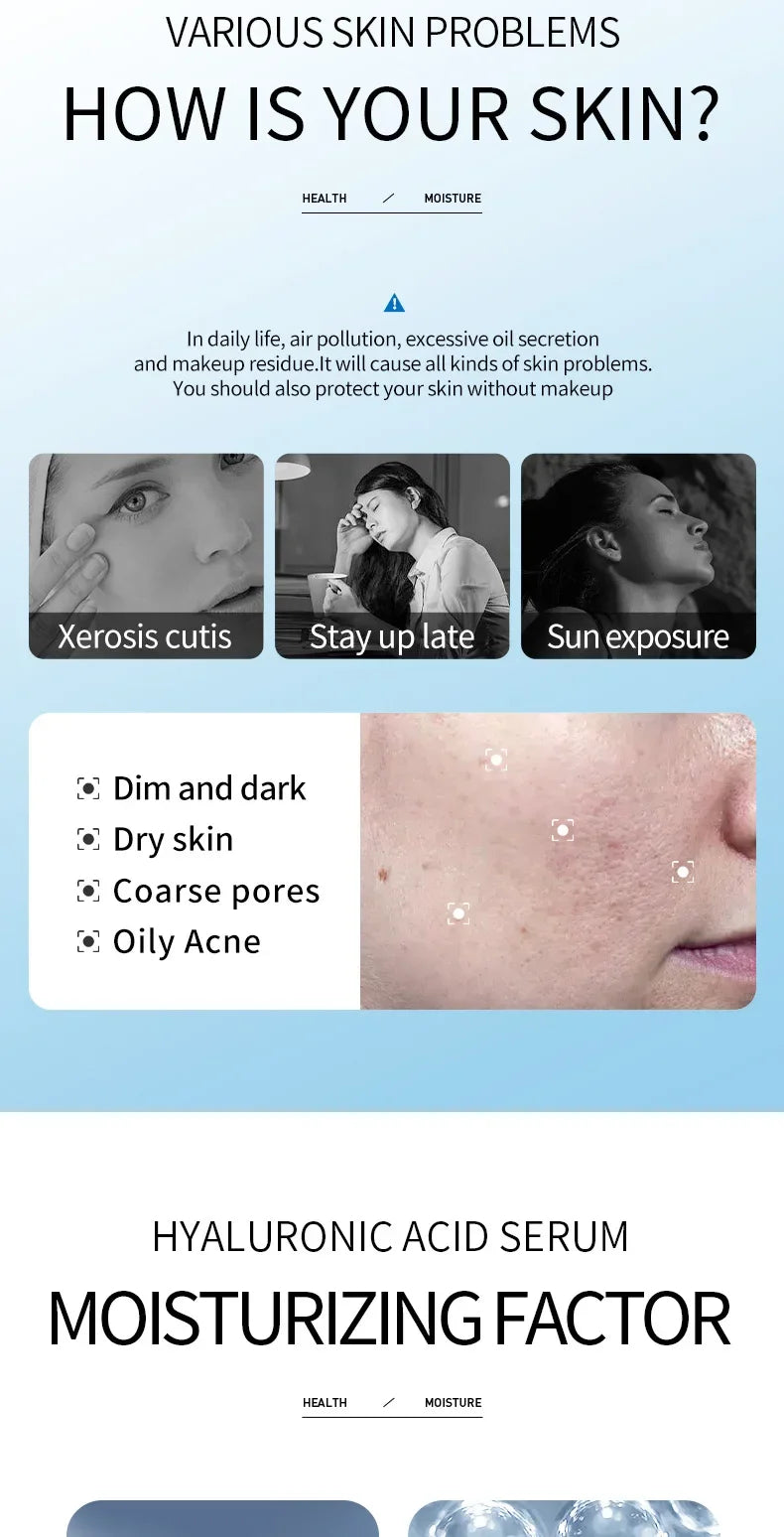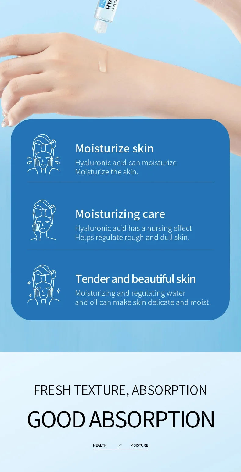 Sérum visage à l'acide hyaluronique essence aqua éclaircissant. Hydrate intensément, réduit les rides et illumine le teint. Formule légère à absorption rapide.