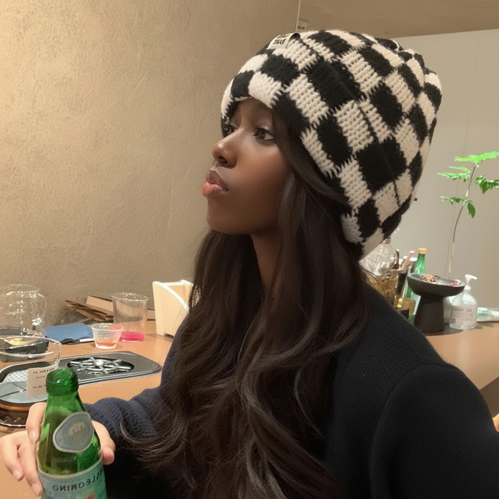 Bonnet Plaid en Laine Tricotée - Style Coréen pour Femme