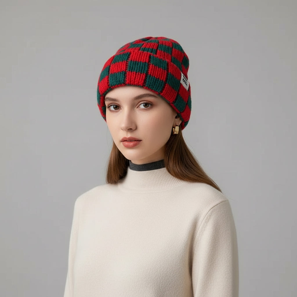 Bonnet Plaid Laine Tricotée Femme - Chaud Hiver Coupe-Vent | MDN