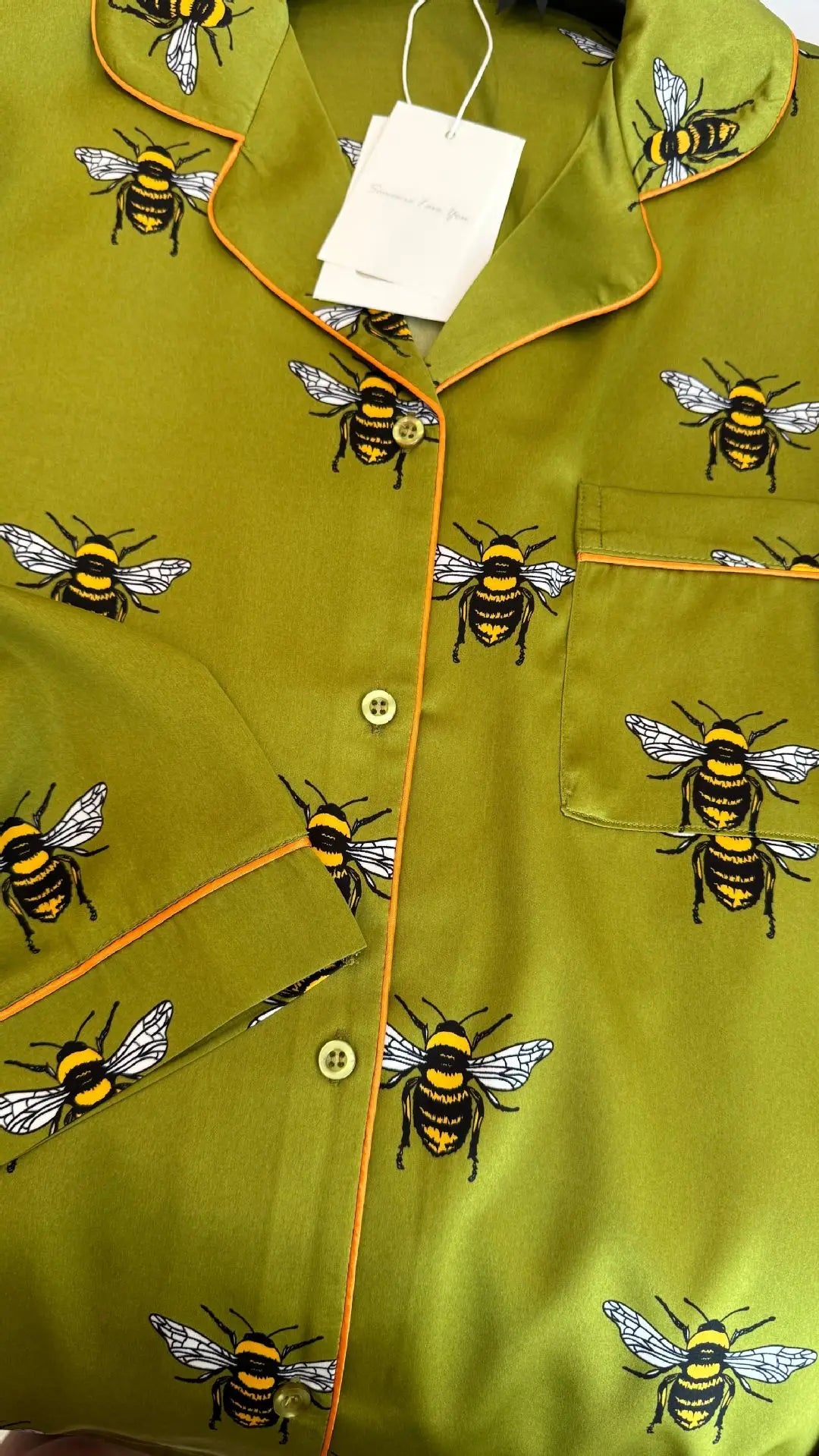 Découvrez ce pyjama satin soie au motif abeilles vert unique et raffiné. Cet ensemble 2 pièces manches longues col revers allie élégance naturelle et confort luxueux pour des nuits stylées.